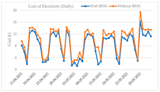 The daily cost of imported electricity with and without the BESS for the period from 13 April 2021 to 30 May 2021 is shown in Figure 11. As the figure reveals, there is a visible difference between the daily baseline cost of energy consumption and the daily cost after implementing BESS in the swimming pool.
