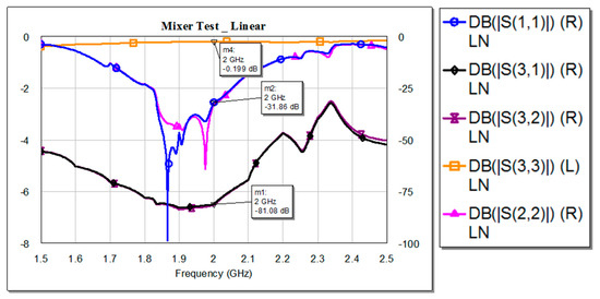 The performance of the designed microstrip mixer can be analyzed based on lumped components equivalent circuit extracted by methods described in references [16] and [34], and transmission lines model described in [35]. We chose to analyze the microstrip mixer using the AWR microwave circuit design software. The AWR uses Maxwell equations to numerically compute the frequency response of the circuit from its physical parameters. The AWR makes it possible to perform accurate analysis using linear and nonlinear harmonic balance, nonlinear Volterra-series, electromagnetic, and spectra simulation, and features real-time tuning and optimizing capabilities. There are several requirements for an ideal mixer: the RF and LO inputs must be interchangeable, a 50 Ω input impedance for both ports, and a high attenuation between the input ports and the output (S31, S32) is essential. The final configuration of the mixer was derived through the optimization of the dimensions of the microstrips and the distance between them. The simulation results are detailed in Appendix A, showing the effects of MS width on the performance of the filters and the mixer. The optimal results are presented in Figure 4, showing that the designed coupler conforms with these requirements. The simulations showed that the power conversion losses were 12 dB and the RF-LO isolation was around 0.5 dB. This is a well-known trade-off in balanced mixers based on 90 degrees hybrid couplers, with high input matching (S11) and low isolation [3]. Full electronic circuit AWR emp software files are provided in the Supplementary Materials.