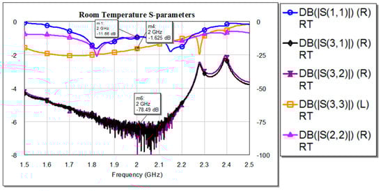 We measured the S parameters as a function of frequency, using a vector network analyzer (VNA). The results are presented in Figure 6. The experimental results, measured at room temperature, were very similar to the theoretical results obtained by simulations (Figure 4). S33 was slightly different, indicating that the impedance matching in port 3 was not high enough. The experimental results agreed well with the simulation results, showing a maximum measured insertion loss of 0.4 dB at 2 GHz.