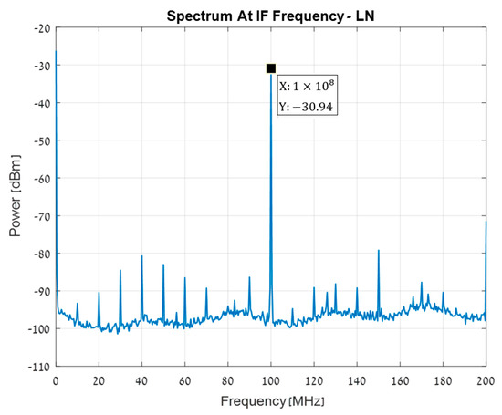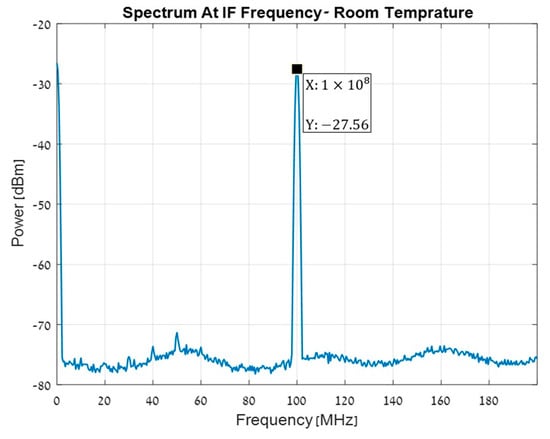 The output power of the IF, measured with SA at 77 K, is shown in Figure 11. The measured power at 100 MHz is PIF = −30.94 dBm. This output is obtained for an RF input power of −20 dBm at 2 GHz, and a LO input power of 7 dBm at 1.9 GHz. Therefore, the mixer Conversion Loss is , where is the RF cable loss.