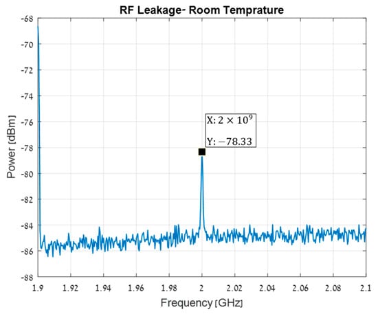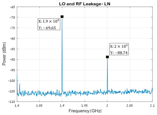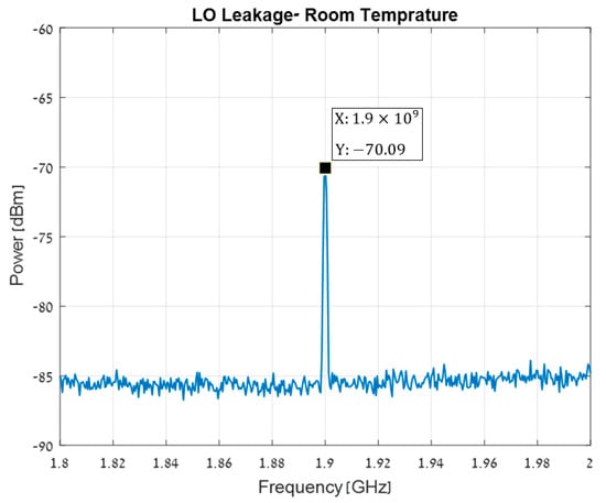 The leakage of the RF frequency to the output is shown in Figure 8. The IF leakage is −78.33 dBc, a clear indication of the high RF-IF isolation. The RF input power is −20 dBm at 2 GHz, the LO input power is 7 dBm at 1.9 GHz, and the output power for the IF is PIF = −27.56 dBm at 100 MHz. The mixer Conversion Loss is therefore , where is the RF cable loss. Figure 9 shows the LO leakage to the output. The high LO-IF isolation is expressed by the very low LO leakage, of around −70.09 dBc.