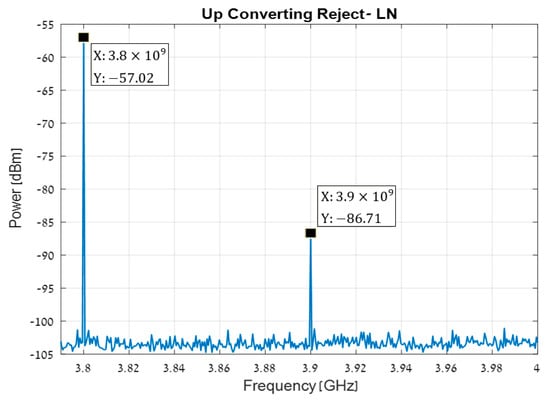 The measured up-converting rejection is shown in Figure 12. At the sum of the LO and RF frequencies, 3.9 GHz, P = −86.71 dBm and at the second harmony of the LO signal, 3.8 GHz, P = −57.02 dBm, i.e., the high frequency filtering is very effective.