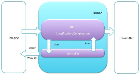 The Vitis API functions are programmed to load the different classifiers proposed in this work as well as the compression encoders based on several parameters, such as battery energy level, and ata transmission rate. The API propagates the images through the classifier on the DPU for accelerated inference, then takes the output data, which is then used to configure the DPU again with the compression encoder weights and instructions for accelerated compression. Finally, the API takes the compressed image out from the DPU, store it in the off-chip memory, then send it to the specified destination.