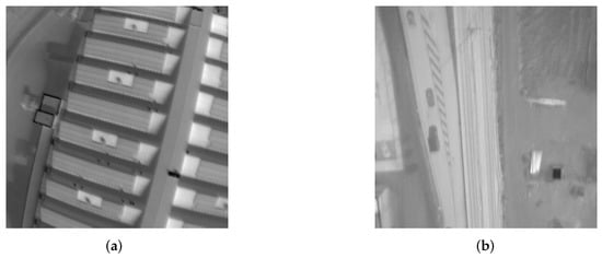 The classification and compression units are designed as CNNs. We use, without loss of generality, the aerial thermal image dataset provided by SenseFly in [11] to train and test the classification and compression units. The dataset is a series of thermal images captured by a drone that monitors solar panels installation. For classification purposes, the images are grouped into two classes: images with solar panels, and images without solar panels. Sample images of the two classes are shown in Figure 2. The images are greyscale of size 512 × 512. The following section provides the detailed design of the classification and compression units.