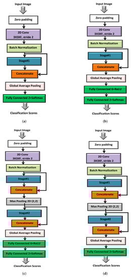 The designed classifier combines the concepts of separable depthwise convolution from MobileNet v1 [15], the inverted residual from MobileNet v2 [16], and the feature map concatenation from DenseNet [14]. Figure 3 shows the architecture of different classifier models. Different models have different complexities (i.e., different numbers of parameters). For example, the models in Figure 3a–c have 5858, 2052, and 7556 parameters, respectively. The model in Figure 3d can have two forms: the thick form which has 24,802 parameters, and the thin form which has 7282 parameters. The notion thick or thin depends on the number of output features of the first 2D conv block (denoted by F in Figure 3). A thick model has , while a thin model has . As shown in the figure, all the models have the same core architecture with variation in the length (the number of stages), the thickness (the number of feature maps), and the number of dense (fully connected) layers at the output. This allows a simple hardware switch between the different models by disabling some connections/layers. The model switch should be guided by a higher-level decision based on the available battery energy, remaining operation time, and required accuracy.