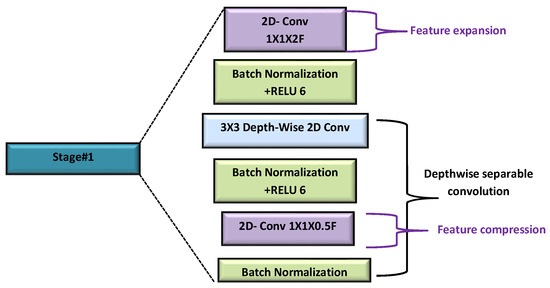 Figure 4 shows the structure of the “stage” block in Figure 3. Like MobileNet v2, each “stage” block consists of three Convolutional (Conv) layers. The first Conv layer doubles the number of input feature maps, denoted by F in Figure 4. The second Conv layer is a depthwise convolution. The depthwise convolution along with the third Conv layer are the equivalent of a depthwise separable convolution. The third Conv layer halves the number of input features. The flow of feature expansion, followed by depthwise convolution and feature compression has been presented in [15,16] to reduce the design complexity. Batch normalization layers normalize the input using the batch statistics (i.e., mean and variance). This normalization keeps the input from going to very high or very low values, and consequently improves the stability of CNNs. It also has a slight regularization effect as it adds some randomness to the input features. The input of each “stage” block in Figure 3 is concatenated to the stage output to allow the propagation of coarse and fine detailed features through the network. Feature concatenation has been proposed in DenseNet [14] to reduce the need to learn redundant features, and it also allows fast access to the gradient during backpropagation. The Max Pooling layer between stages in Figure 3 reduces the size of the input to the next stage, and the global average pooling layer is used, instead of a dense layer to reduce the complexity by reducing the number of variables. The dependence on the average of each feature map in classification also reduces the chances of overfitting the training data.