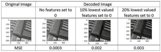 The proposed autoencoder consists of Conv layers and downsampling/upsampling layers as shown in Figure 5. The first half of the autoencoder is the encoder (at the transmitter) and the second half is the decoder (at the receiver). The Conv layers in the encoder part extract the features of the input image and the downsampling layers reduce the size of the feature maps (for compression). The size of the encoder output is a 128 × 128 feature map compared to a 512 × 512 input image, which allows a 16:1 compression ratio. The compression ratio can be further increased by setting the lowest valued features on the output feature map to 0. The benefit of such variable-rate compression is that the transmitter has the freedom to change its compression rate based on many factors including the image significance and the battery energy level. This adjustment does not require any change in the architecture or extra communication between the transmitter and the receiver to inform the receiver of the new compression rate as the receiver still receives the same expected number of features but with some of them zeroed. The Conv layers in the decoder part combine the received features to recover the original image, upsampling layers are used in the decoder to reverse the operation of the downsampling layers in the encoder. The autoencoder has a total of 3298 parameters. Table 2 shows the auto-encoder loss. Figure 6 shows a sample input image and the decoded images when different percentage of the encoder features are set to 0.
