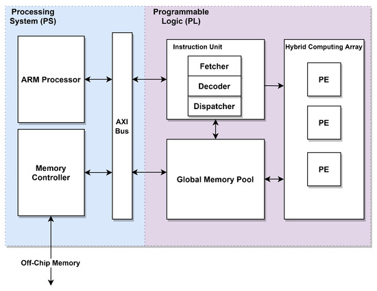 Figure 7 depicts the internal architecture of the DPU, which fundamentally consists of a scheduler module, Processing Engines (PEs), instruction unit block, and global memory pool module. The Application Processing Unit (APU) is the ARM processor, on which the application is running, serves interrupts and data transfer from and to the DPU. The instruction unit handles reading and executing the instructions associated with the different operations of the accelerated CNN. The Fetcher’s main role is to fetch the DPU instructions associated with the model from the memory. Following that, the decoder is responsible for decoding the instructions to drive the PEs. The dispatcher is responsible for managing the data/instructions transfer among the PEs and the memory. The Global Memory Pool acts as a buffer for the input and output data as well as intermediate output from the DPU, which results in high throughput.