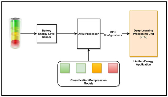 In this work, the unified DPU hardware accelerator is used to accelerate all the models proposed without making any modification to the original system setup. The accelerator is configured based on the battery energy level which makes the entire system energy adaptive, as shown in Figure 8.