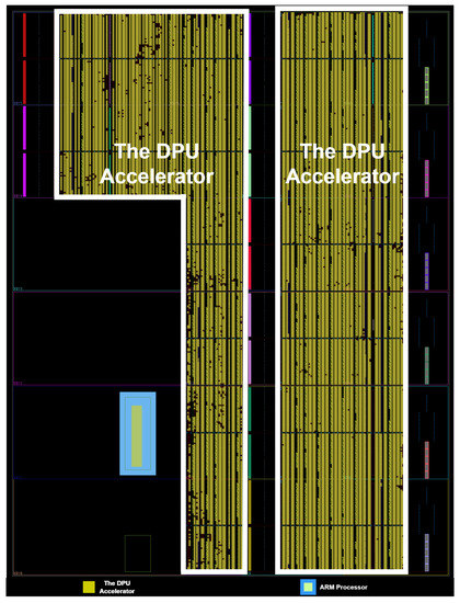 As demonstrated in Figure 7, the DPU is connected to the ARM processor on the FPGA chip to manage task scheduling and offloading weights and data to the DPU. The DPU is connected to the ARM core through an AXI Bus that carries data and weights to the DPU. In addition, Mixed-Mode Clock Manager (MMCM) block is used to generate required frequencies. Table 5 demonstrates the resources utilization of the DPU on the ZCU 104. The MMCM block consumes less than 1% of the total DPU resources. Table 6 shows the power consumption of the DPU at 300 MHz. The DPU power consumption and resource utilization are optimized by leveraging special UltraRAM slices [30]. The UltraRAM is a novel memory solution by Xilinx, which introduces higher memory speed with low energy consumption and resource utilization. The DPU operates with 4 MB memory attached to it coming from both URAM blocks as well as BRAM blocks. This amount of memory is enough for this application and for any future scaling of the system. The floorplan of the DPU is illustrated in Figure 9.