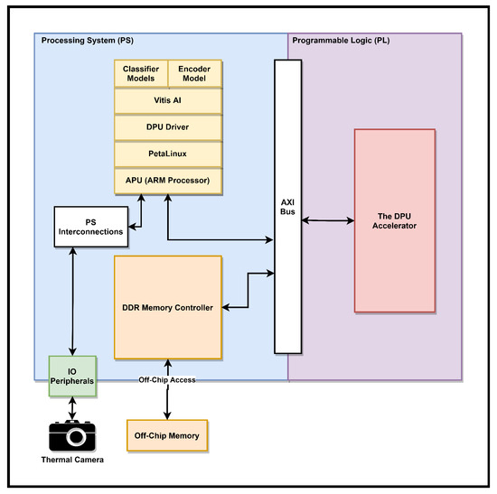 In these experimental results, Xilinx Zynq UltraScale+ MPSoC ZCU104 Evaluation Kit is used. Figure 10 shows the DPU hardware accelerator coupled with the ARM processor. On the top of the system, the five classifier models and encoder model reside and are managed by a custom API that uses Vitis AI library functions to manage the communications between the APU (The ARM Processor Unit) and the DPU accelerator. The Vitis AI API library communicates with the DPU driver to handle the data movement between both sides of the system, which are all controlled by the Petalinux OS that runs on top of the ARM processor.