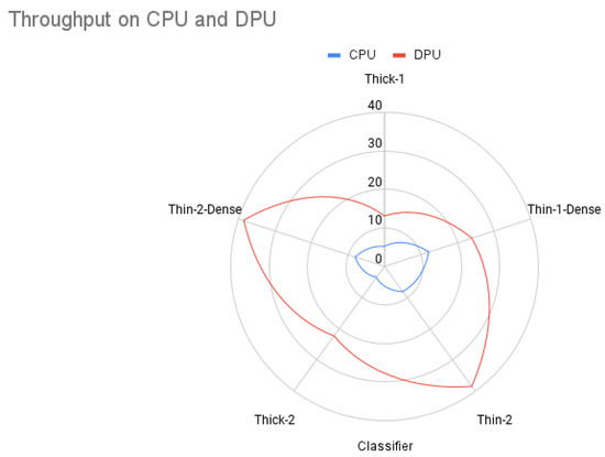 Furthermore, the system throughput is evaluated by the overall inference time on both CPU (Intel Processor) and the FPGA to show the hardware acceleration benefits. The Intel CPU power consumption is estimated to be 84 W [31]. As demonstrated in Table 6, the total power consumption of the DPU is measured and equals 11.65 W.
