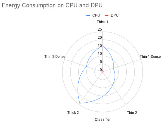 In terms of energy consumption, the DPU achieves a significant reduction in the energy consumed during inference time, which saves at least 93% of its counterpart on the CPU, whereas the maximum energy saving achieved has been 97.8%. As a result, this makes all the models suitable for IoT applications. Based on the battery energy level, one model is configured to the DPU trading-off accuracy to lengthen the battery life [32]. The gap between the energy consumption on the CPU and the DPU can be realized from Figure 14.