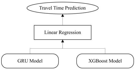 - Hybrid Models. Following the TT prediction literature [33,35], we selected multiple hybrid models by combining one deep learning model and one ensemble learning model in combination with a linear model for final prediction. Figure 2 shows the architecture of the hybrid model used. In this architecture, two different types of machine learning models are combined, and then the output of those two models is passed through a linear regression model to get the final result. In this study, four hybrid models are considered: a GRU model in combination with LightGBM, a GRU model in combination with XGBoost, an LSTM model in combination with LightGBM, and an LSTM model in combination with XGBoost.