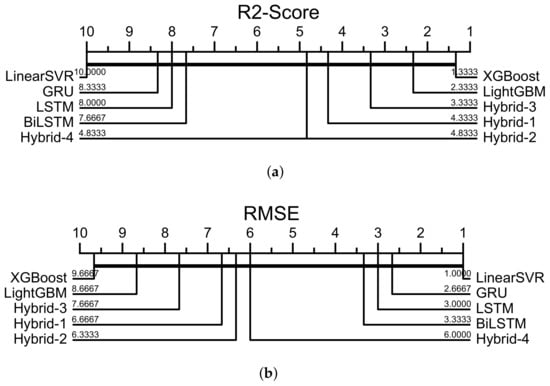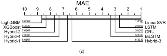 For validating the best performing models and comparing their performance across data sets, we followed the recommendations by Demšar [50]. After establishing the statistical differences among the implemented machine learning models by applying the Friedman test [51], we used the pairwise post-hoc analysis [52]. In this analysis, the average rank is replaced by Wilcoxon signed-rank test with Holm’s alpha correction. Finally, the results for model comparison are plotted using critical difference diagrams (CD-diagrams) for RMSE, MAE, and for all three data sets and machine learning models [53]. In the critical difference diagram, a thick connecting line represents similar models grouped, which means the difference in performance between those models is insignificant.