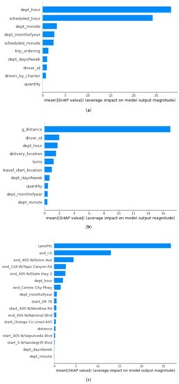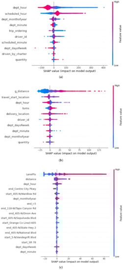 This paper focuses on TTP in the logistic industry. TTP studies have developed a range of different data-driven methods from statistical [6] and traditional machine learning models [7] to advanced neural network-based models [8,9]. However, a few studies applied and compared various data-driven TTP methods. In particular, there is a lack of studies on the impact of spatial and temporal travel features on the accuracy of different types of TTP models. Understanding such impact is of great significance for improving the performance level of travel planning services [10,11]. Furthermore, while data-driven TTP models achieve high performance, studies that focus on their explainability are absent. Identifying the key parameters of trained models and the rationale behind them make sophisticated AI models understandable to human analysts. It sheds light on the inner workings of trained models and explains individual predictions which a model makes. As a result, it is easy to rely on the predictions since the meaningful explanations help analysts gain trust in them.