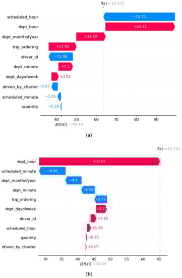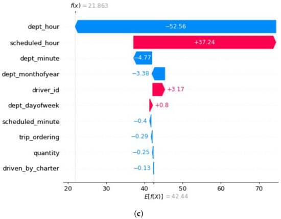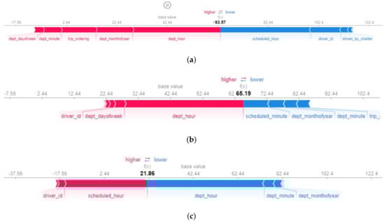 Figure 6 shows three instances of using the waterfall plot for the TT predictions made by the XGBoost model. The positive effect of the feature pushes the prediction higher from the base value, as shown in red, and the negative effect pushes the prediction lower, as shown in blue. In instance 1, we can see that the feature scheduled_hour pushes the prediction 35.73 min lower, while the feature dept_hour pushes the prediction 34.71 min higher. In instance 3, the feature dept_hour has a negative effect of 52.56 min. The force plot in Figure 7 provides a similar representation of the explanations but without exact numerical contributions. Each feature pushes the prediction lower or higher depending on the importance of that feature in that particular prediction. We can observe that scheduled_hour and dept_hour are comparably more critical than any other features for the three arbitrary prediction instances considered.