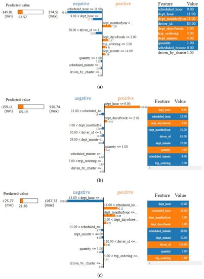 Figure 8 depicts the explanations for three travel time prediction instances of the XGBoost model using the LIME method. The blue color shows a negative contribution to travel time, i.e., increasing time, while the orange color shows a positive contribution. The plot shows the essential features, relative importance/contributions, and actual values for a given prediction. As an example, consider instance 2. The departure hour is 8 and caused an increase in the travel time. On the other hand, the scheduled hour is 12, and reduced the travel time.