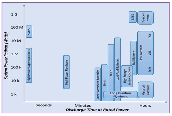 Although the RESs are free and available almost everywhere, they require a considerable investment cost to be converted to electrical energy. The investment cost is dependent on the location and size of the distribution system. Various strategies for integrating the RESs in microgrids have been discussed in [,,,]. In [], the authors present a survey of the planning of distributed generation in distribution systems, where they reviewed the effects of the system operating characteristics and conditions of DG systems, such as their reliability, stability, electric losses, and voltage profile. Reference [,] described different types of energy storage technologies and their applications. Although a number of them have been developed and commercially available, many are still under research and have received research support recently. ESS differ in the rate of charge and rate of discharge [], energy capacity, and power capacity [,]. Consequently, storage technologies differ in size and weight. Figure 1 describes the characteristics of different ESS technologies []. The figure shows that BESS, such as lithium-ion, nickel–cadmium, lead–acid, etc, have higher energy capacities and a medium power rating. The power rating of the lithium-ion battery is in the range of 10 kW–100 kW, and that of Ni-Cd can be as high as 1.5 MW. Li-ion and Ni-Cd have commonly been used in RE power integration [,].