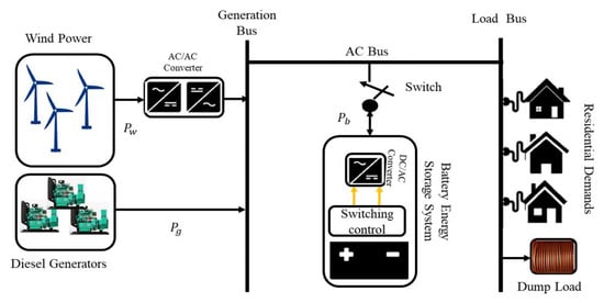 In formulating the problem in this study, we consider a microgrid configuration of the type displayed in Figure 2. The microgrid is configured such that it can switch its operation between BESS connected mode and BESS disconnected mode. The wind power, which is the only RES, and three diesel generators are connected through the generator bus to the AC bus. Furthermore, the residential demand is connected through the load bus to the AC bus. There is also a dump load connected to the load bus that consumes the excess power after the demand is met and the BESS is fully charged. This prevents the BESS from being overcharged or the network lines from being overstretched. The BESS is connected directly through the switch to the AC bus. It is assumed that the battery has its converter and switching controller within the BESS module, and so the operation of the converter topologies and their control is beyond the scope of this study.