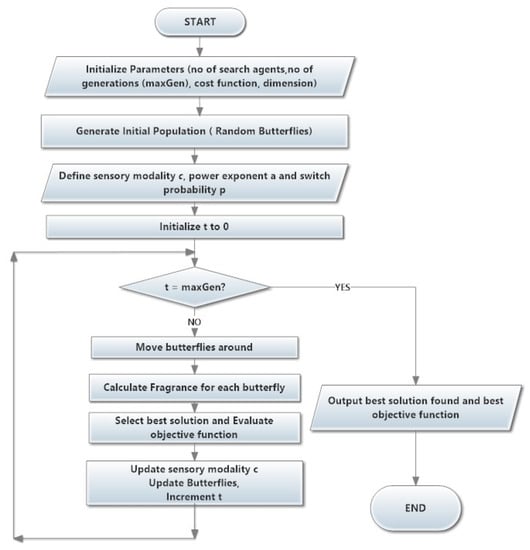 After each iteration, i.e., butterfly movement, the butterfly with the best objective function is then selected. Based on the new objective function, the sensory modality c of each butterfly is updated. This cycle continues until the stopping criteria are met. Such criteria could be the amount of CPU time utilized, the maximum number of cycles achieved, the maximum number of iterations without any fitness improvement, a specified error range, or some pre-specified number of iterations. The commonly used stopping criteria is a pre-specified number of iterations. We also intend to use this in this paper. At the final stage, all calculations are carried out and the butterfly that achieved the minimal cost function is selected.