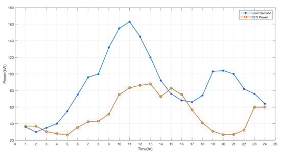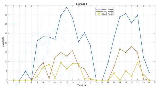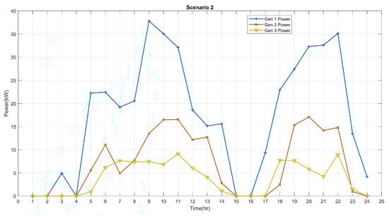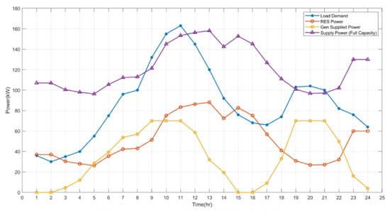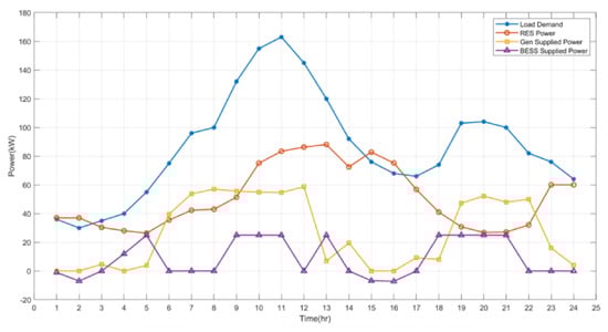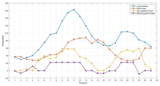 In Figure 4, we present a typical load profile of a residential area alongside the wind power profile used to test the proposed strategy in this work. From Figure 4, we can observe that, for most of the 24 h, the demand is greater than the power supplied by the RES. At these periods, the generators and the BESS supply the remaining powers needed to meet the demand. However, for very few periods, when the RES supply is greater than the demand, the excess powers are used to charge the BESS. To maintain the SOC of the BESS at an appreciable level for smooth and efficient running, the generators can be used to charge the BESS when needed; for instance, when the cost of discharging the BESS is greater than the cost of operating the generators. This condition occurs after the continued use of the BESS results in the depletion of the SOC of the BESS, thereby raising its discharge cost. Therefore, the BESS must operate at an optimal SOC, so that the state of health of the BESS is preserved and its lifespan is increased.