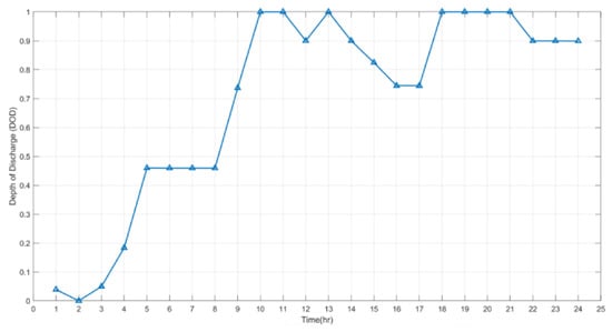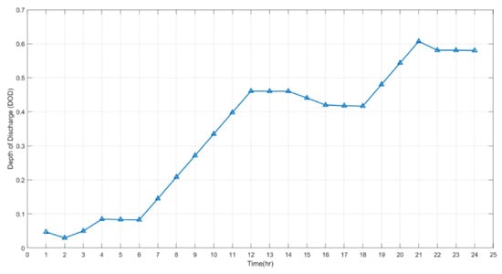 The analysis of the cost of BESS has been shown to depend on the life-cycle of the battery [,]. The life-cycle is dependent on the depth of discharge (DOD) of the battery []. Consequently, the cost of the BESS is also dependent on DOD. The battery DOD (), life-cycle for a given DOD (), and the battery cost () are given in the equations shown in (5).