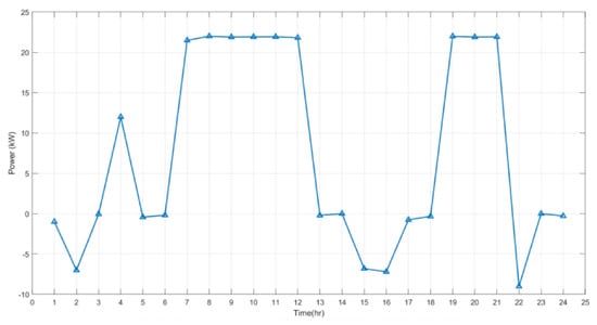 The constraints related to the BESS are expressed by Equations (9)–(13). In this work, we have chosen a positive and negative power convention for the discharging and charging powers of the battery. This means that the battery acts as a load when it is charging and as a generator when it is discharging. The optimization time interval, , is taken as 1 h. At any instance, the power withdrawn from the battery must be within acceptable limits of the battery; this condition is formulated in (9). Furthermore, the discharging and charging constraints of the battery are expressed in (10) and (11), respectively. The is a binary variable that states the operating status of the battery. It is equal to 1 when the battery discharges and 0 when it charges. This variable prevents the charging and discharging of the battery at the same time.