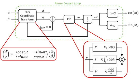The and components are obtained and processed in the Phase-Locked-Loop (PLL) block, schematised in Figure 5. In PLL, the phase shift angle resulting from Park transformation is stabilised and the harmonic components of the active and reactive parts of the input power are determined. Each of the first-order filters introduces an electrical 45° phase shift and an amplitude modulation of , which is compensated by a scalar gain.