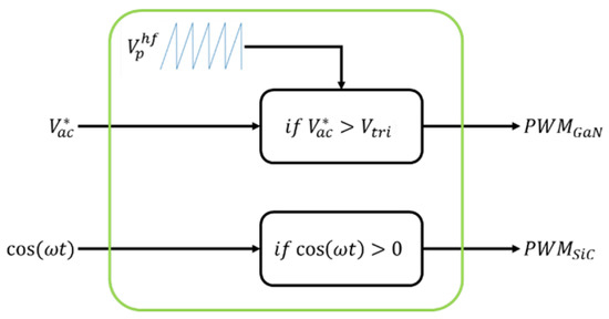 Note that represents the connection to the AC source in the ideal case; obviously the real connection will have to take into account input fluctuations; therefore, an EMI (Electromagnetic Interference) filter has to be inserted. The Totem Pole control is designed to achieve a power factor corrector (PFC) [12], i.e., reactive power minimization. In order to achieve PFC together with DC side voltage level regulation, the control scheme is composed of several functional blocks, as shown in Figure 3.
