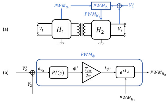 DAB circuit control logic: (a) control scheme of the second H-bridge, , based on time shift with respect to the first H-bridge, ; (b) block diagram of the modulation function.