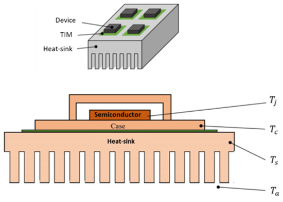 As shown in Figure 11, we consider a vertical layering of each switching device characterised by a junction (representing the hottest point), the casing, the insulating material, and the heat sink. Figure 12 shows the most common equivalent circuits describing thermal behaviour used in the context of the design of power electronic devices [17].