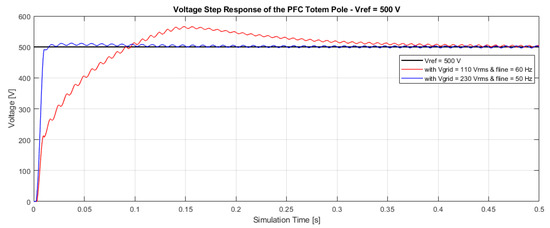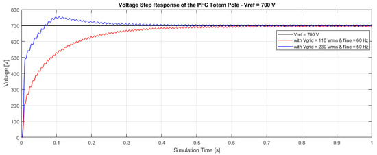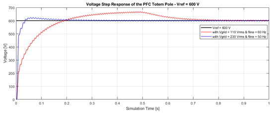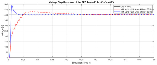 Figure 13 shows the result of voltage control of the totem pole converter when the required DC bus voltage is 400 V. The results obtained with different AC side source are compared. For this operating condition, in the case where the source is 230 Vrms and 50 Hz, the converter behaviour is characterised by a high overshoot (almost 20% with respect to the steady-state value) but with very fast rise and settling times ( s and s). In the case of an AC source with 110 Vrms and 60 Hz, the behaviour of the output voltage is increasingly “ smooth,” with a much smaller overshoot (about 7.5% with respect to the steady-state value), with longer jumping and settling times ( s and s) that remain, however, decidedly acceptable for this type of application.
