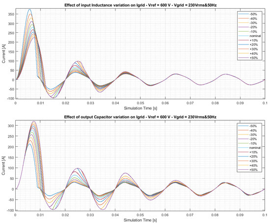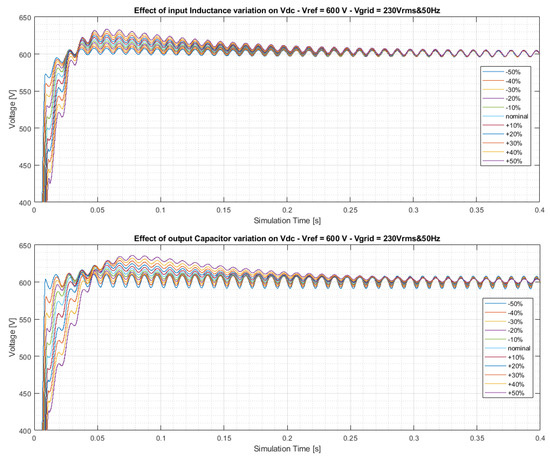 In Figure 20, the transient of the Totem Pole voltage control is shown when varying the value of input inductance on the AC source side (upper) and when varying the output capacitor on the DC bus side (lower). It can be observed that the control is robust in both cases within a reasonable range of variation (). In particular, as output capacitance decreases, residual ripple increases due to the fact that a lower capacitance can “absorb” a lower charge in the conduction phase.