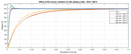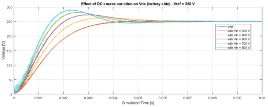 Figure 22 shows the variation of the response of the DAB converter as the voltage source (Totem Pole side) changes when an output voltage (battery side) of V is obtained. It can be observed that as the input voltage supplied to DAB decreases, the system tends to behave more similarly to a first-order system. In fact, higher corresponds to faster rise times with overshoots greater than the steady-state value.