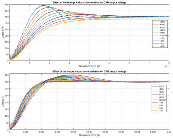Effect of the transformer primary side inductance (top) and output capacitor (bottom) variances on the voltage control in the DAB converter.