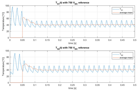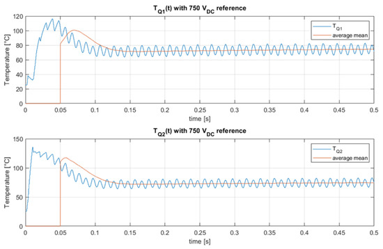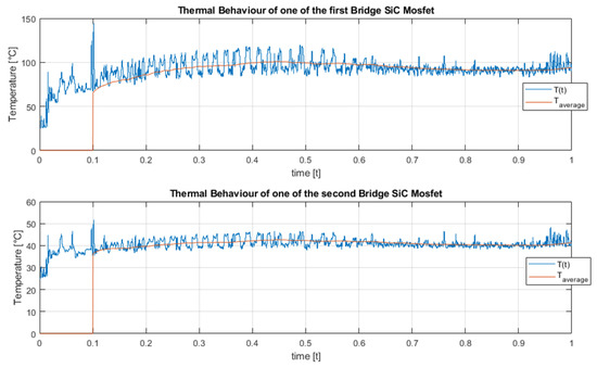 The thermal behaviour of the SiC devices comprising the DAB converter is shown in Figure 28. In both cases, the average temperature under continuous conditions remains within the declared limits of the data sheets of the real reference devices as well as the peak temperature of the junction remains below 150 °C. It can be observed that the devices in the AC/DC conversion module reached much higher temperatures than those in the AC/DC module. This could be due to the presence of the transformer, which in fact creates an insulation and prevents a continuity of current that results in different temperature ranges. Similar values were obtained in the other operating conditions analysed in the evaluation of the robustness of control algorithms.