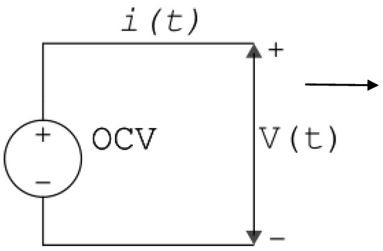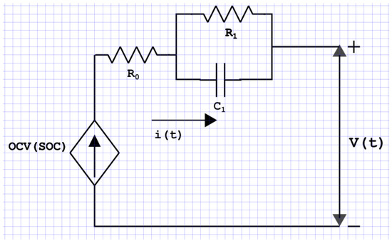 1-RC pair model. Where V is the terminal voltage (V), VOCV is the Open Circuit Voltage (V).