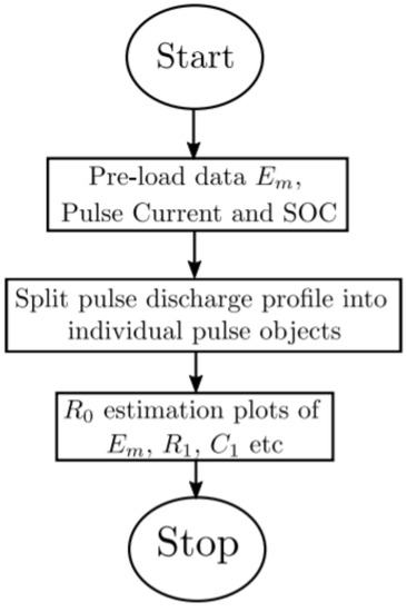 The cell parameters (R0, R1, …, R5, C1, C2, …, C5) can be estimated using the PowerTrain blockset using MATLAB/Simulink. Figure 5 shows the flowchart employed for the estimation. This estimation was used to initially obtain the cell parameter values. These values were used as reference values for ML algorithms, as shown in Section 4.