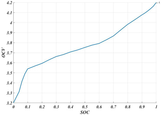 Figure 6 shows the OCV–SOC plot for NASA dataset. As shown in Table 2, cell voltage varies from 4.2 V to 3.2 V. Figure 7 shows the cell model developed using MATLAB/Simulink. The cell parameters are modeled as look tables and for the estimation of SOC, Coulomb Counter method (CC) is used shown in Equation (1). Figure 8 shows the voltage response of the Li polymer cell [5] for one RC pair. Figure 6 shows the OCV–SOC relationship for the Li ion cell as per the NASA dataset. As seen from Figure 6, the voltage varies from 3.2 V to 4.2 V for the NASA dataset.