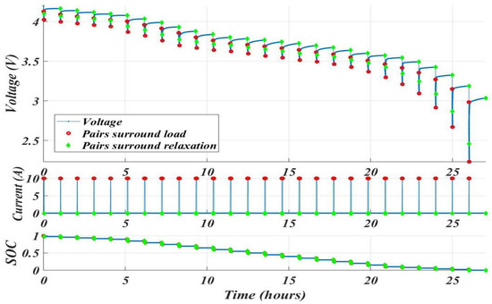 Figure 9 shows the terminal voltages for pulse discharge current profile. The corresponding SOC is shown in Figure 10. Figure 11 shows the error in the terminal voltage after tuning the cell parameters. It is observed from Figure 11 that the error in the terminal voltages is <±0.2 V with a mean error and standard deviation of 0.0529 and 0.0310 respectively. The curve fitting equation associated with error is shown in Equation (2). The R- squared/regression co-efficient was found to be 0.988.