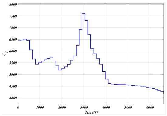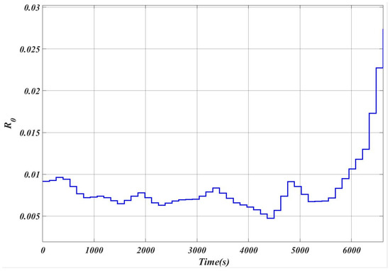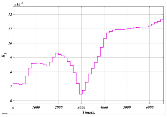 The cell parameters R0, R1 and C1 vary as a function of SOC. Figure 14 and Figure 15 show the variation of R0 and R1 respectively. It is observed that R0 and R1 gradually increase after the completion of the discharge cycle. Figure 16 shows the variation of C1 with respect to time.