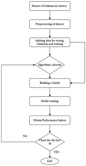The major challenge in a battery management system is the parameter estimation and prediction of SOC, and this is because the degradation of battery is highly nonlinear in nature. This section presents the parameter estimation and prediction of state of charge of Lithium ion batteries by implementing different machine learning techniques. The selection of the best suited algorithm is finalized through the performance indices mainly by evaluating the values of R-Squared, MSE and RMSE. For the estimation of the parameters to be done, the data is mainly taken from the training dataset. This dataset is used for the data-driven algorithmic models. The obtained data from the Li ion batteries are further preprocessed, where the dataset is re-sampled, normalized and they are split and separated for training, validation and for testing. These separated data in the training set is selected for the algorithm training and further used for building the model. Algorithms are selected for training the model, which evaluates the performance indices, through which a suitable algorithm can be selected for estimation and prediction. These steps are summarized in the flow chart shown in Figure 18.