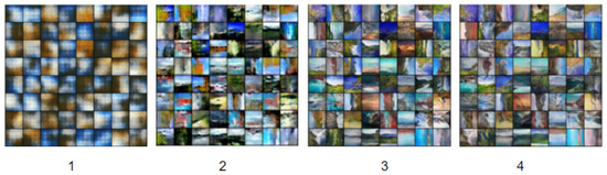 The training parameter configuration that yielded the best results utilised a latent space of 150, image size of 64 × 64, and a training duration of 2000 epochs. The progression of image generation is shown in Figure 30. From the first image to the last, a gradual improvement in generated images is shown. The first plot is very pixelated and shows only a few colours; the second plot has a better distribution of shapes across all image samples, but many samples still appear granulated; the third plot is a vast improvement compared to the previous; and the last plot shows the clearest samples thus far.