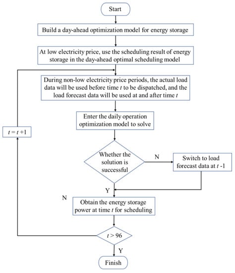 Due to the error of the day-ahead load forecast, when the system adopts the results of the day-ahead optimization model of the energy storage, there is a power imbalance in actual operation, which causes a great burden on the large power grid. The rolling optimization strategy of energy storage intra-day operation updates the system status to the latest after each system operation, and performs feedback correction on the system, which can smooth power fluctuations and improve the robustness and accuracy of system operation optimization scheduling.