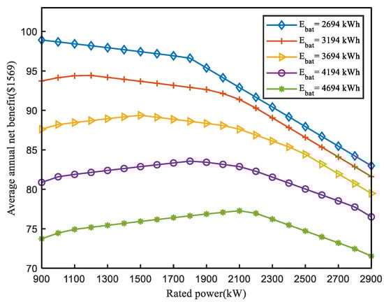 Since the large industrial users selected in this example are pursuing long-term benefits, they choose to configure the lithium iron phosphate battery with the longest operating life and the largest net benefit in the whole life cycle. According to the configuration of the lithium iron phosphate battery in Table 4, the rated capacity is 2694 kWh as the benchmark, 500 is the step length, and a total of five capacity values are taken. When the rated capacity of energy storage is different, the change of the average annual net income of users with energy storage power is analyzed, as shown in Figure 5.