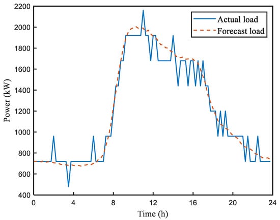 It can be seen from Figure 6 that the load forecast curve and the actual load curve have basically the same changing trend. However, the actual load curve has large power fluctuations, and there are many valleys and peaks, while the power change of the load forecast curve is relatively stable. This difference is caused by load forecast errors and is difficult to avoid.