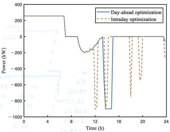 In order to illustrate the effectiveness of the intra-day rolling optimization scheduling strategy, Figure 7 compares the output curves of energy storage under the two optimization methods of day-ahead and intra-day. It can be seen that during the low electricity price period (0:00–7:00) of the two optimized operation methods, the energy storage is uniformly charged, and the “low storage and high discharge” arbitrage is used to improve the economic benefits of users. However, due to the existence of day-ahead load forecast errors, the energy storage curve in the discharge phase is quite different. Due to the continuous update of the rolling optimization model, there are multiple discharges in the energy storage during the optimization operation in the day, which is more in line with the volatility of the load power under actual conditions, and avoids the occurrence of no electricity to be discharged due to excessive discharge of energy storage, and improves the utilization rate of energy storage to a certain extent.