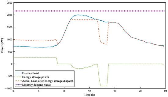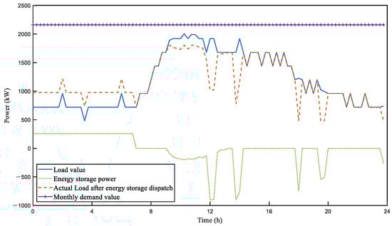 The rolling optimization of the daily operation of energy storage determines the charging and discharging power of the energy storage based on the load forecast data and the latest feedback actual load data, under the premise of meeting the system constraints, with the goal of maximizing the daily income. But only the energy storage plan value for the first time interval is executed. This is repeated over time until the energy storage completes the day’s scheduling. The optimization result is shown in Figure 9; it can be seen that the energy storage output can quickly respond to actual load power fluctuations during daily operation, and the coordination ability of the entire user system is further strengthened, making it easier to reach a balanced state. The rolling optimization strategy running within the day can dynamically respond to load forecast errors, effectively cut peaks and fill valleys for user systems, and reduce peak load.