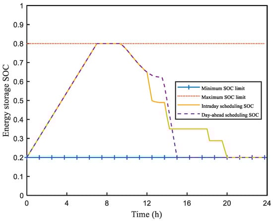 Comparing Figure 8 and Figure 9, it can be seen that the energy storage operation under the rolling optimization strategy of intra-day operation is more reasonable, and energy storage has different levels of output during the two peak electricity price periods. However, under the day-ahead optimization scheduling method, the energy storage has been completely discharged during the first peak electricity price period, resulting in no electricity to be discharged when the discharge is required at the subsequent peak time. This can also be seen in the SOC comparison results of the day-ahead operation and intra-day operation of energy storage in Figure 10.